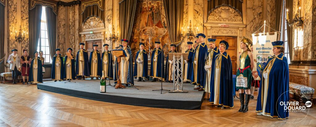 Au son des trompettes, en grande tenue d’apparat de velours bleu et or, la Commanderie présidée par son Grand Maître, fait subir aux nouveaux postulants l’épreuve de vérité : le « dépucelage » de la bouteille, sur l’injonction du Bouchonnier.
